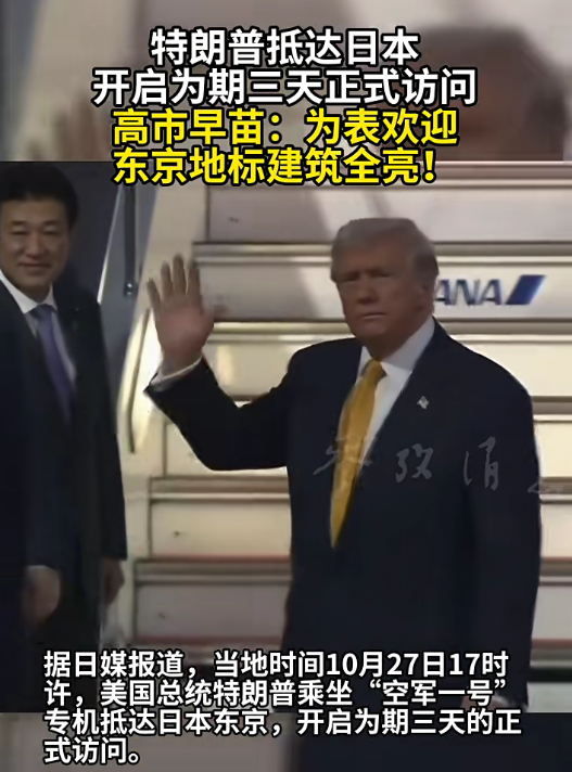 据日媒报道,当地时间10月27日17时许,美国总统特朗普乘坐“空军一号”专机抵达日本东京,开启为期三天的正式访问。日本首相高市早苗在社交平台发文表示欢迎,并称“东京地标建筑已经全部点亮”。